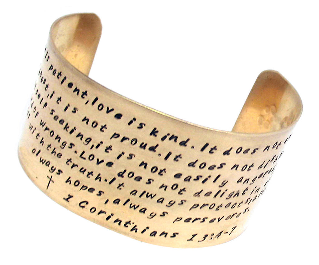 If the message of the Bible is to take the love we feel for those closest to us, and extend that love, and that trust, to everyone we meet, no passage better characterizes that love than Corinthians 13:4. This 1.5" wide cuff, made of jeweler's brass, has the passage from Corinthians 13:4 to Corinthians 13:7, listing all the many qualities that make love not just enjoyable and desirable, but morally exemplary.