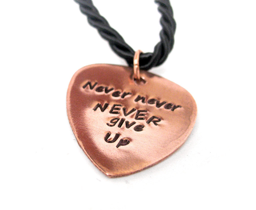 A bright, solid copper guitar pick pendant, stamped by hand with ‘Never, never NEVER give up.’  It hangs from a braided black silk cord, though we can substitute a black leather or cotton cord if you prefer.