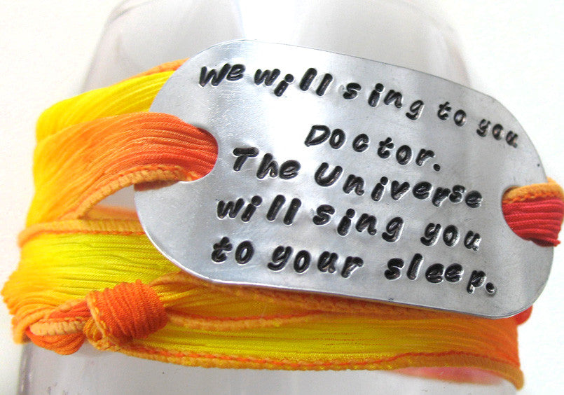 We will sing to you, Doctor… - Aluminum Handstamped ID Bracelet w/Silk Wrap