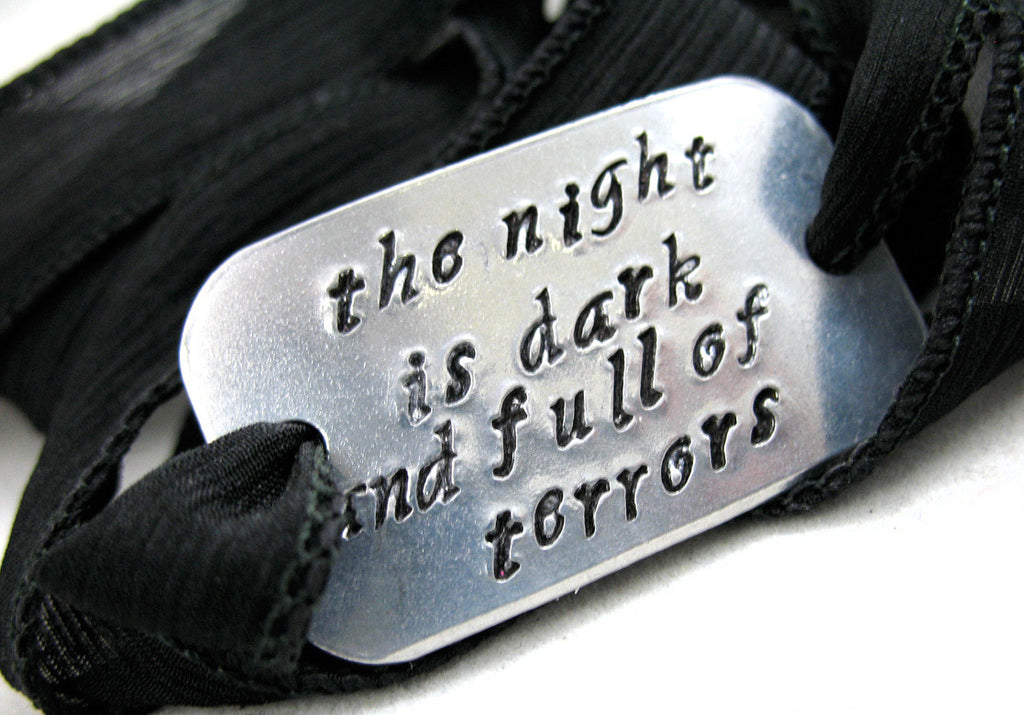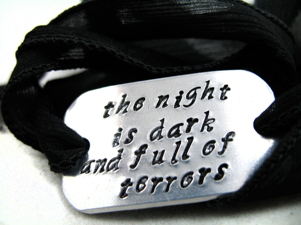 The Night is Dark and Full of Terrors - Aluminum Handstamped ID Bracelet w/ Silk Wrap