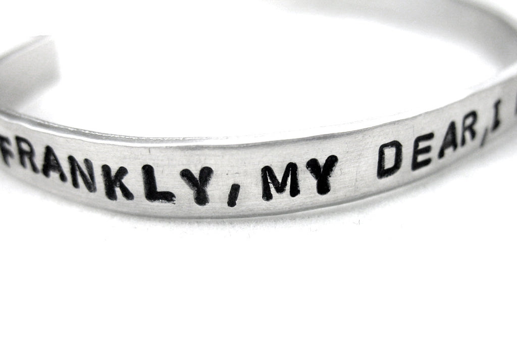 ‘Frankly my dear, I don’t give a damn’. The immortal words of Rhett Butler are captured here on a shiny aluminum bracelet, 1/4" wide and so lightweight and comfortable you may forget you're wearing it!