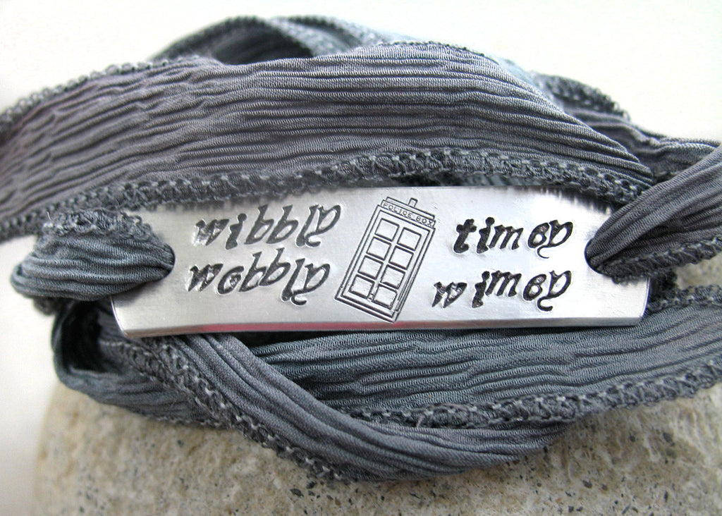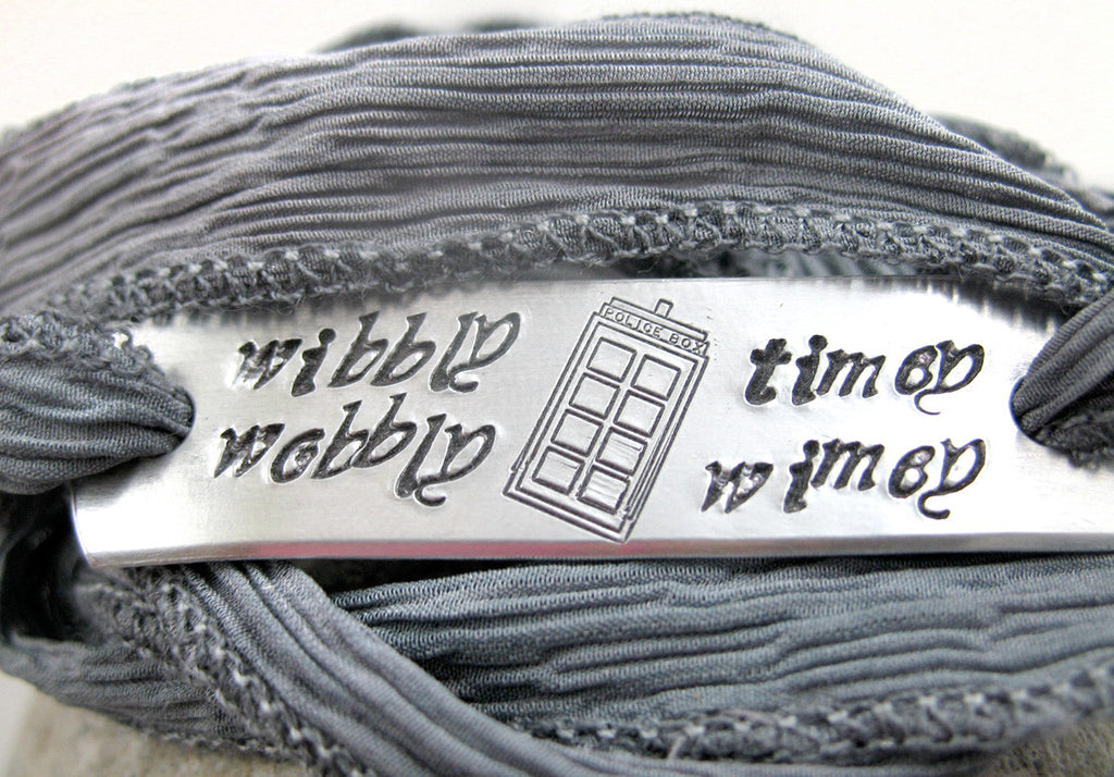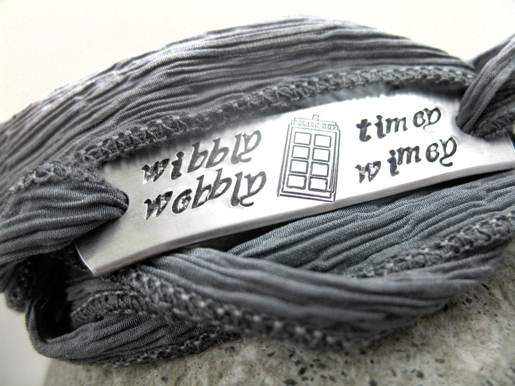 Wibbly Wobbly Timey Wimey - [Doctor Who] Aluminum Handstamped ID Bracelet w/Tardis on Grey Crinkled Silk Ribbon