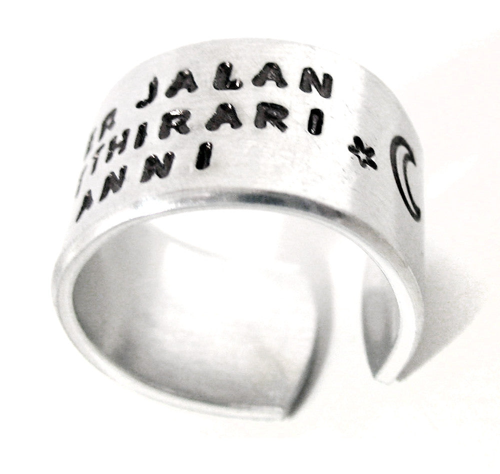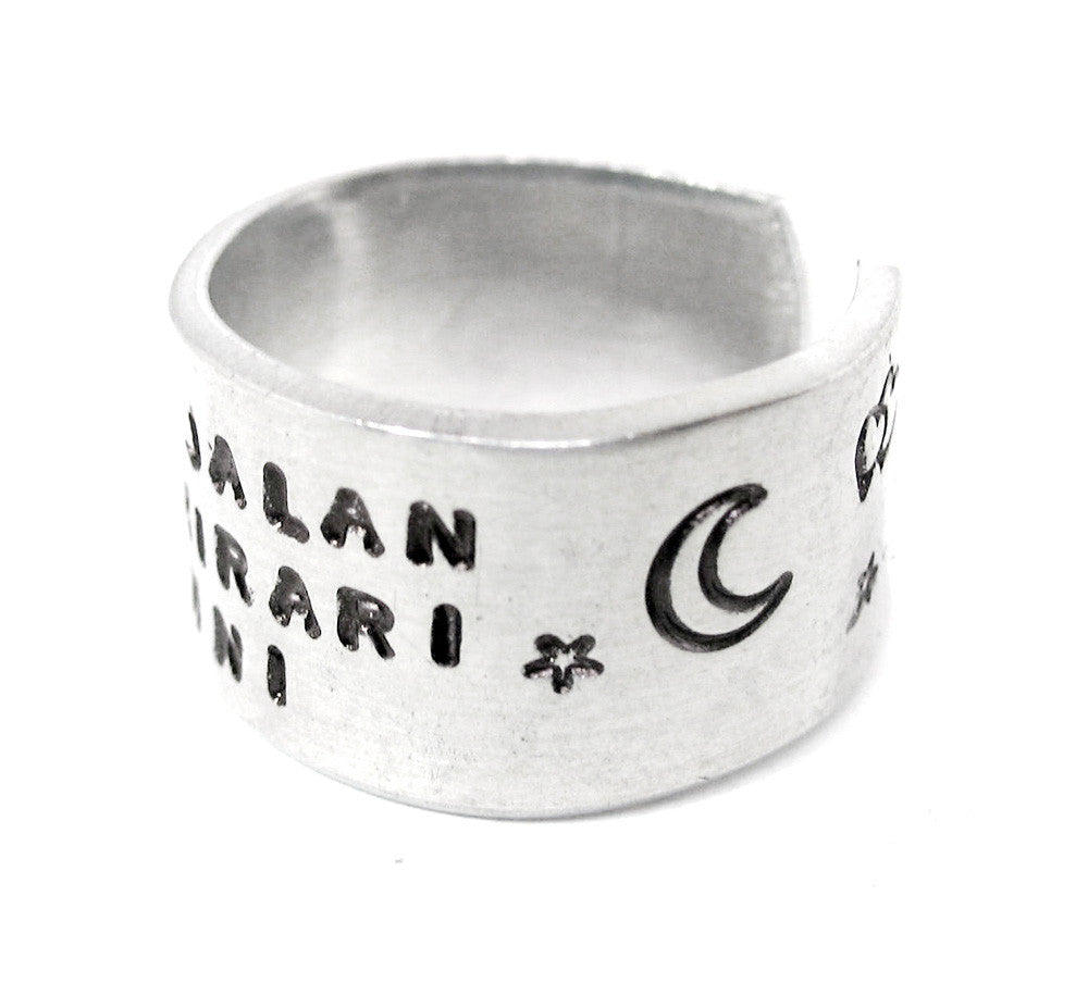 This .5" ring has been stamped with Drogo's term of endearment for Danaerys from A Song of Ice and Fire, ‘Moon of my life’. It's been stamped in Dothraki, so that only a true horselord can read it. It's aluminum, so it's hypoallergenic, and won't stain your skin, and is in our tiny arial capitals font. The ends of the ring have been stamped with our tiny moon, stars, and hearts stamps.