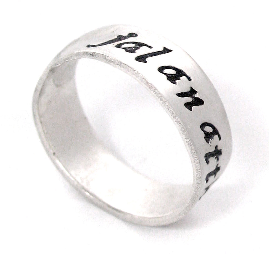 This 1/4" ring is stamped with our Script (lowercase) font, and soldered close. Because this ring cannot be adjusted, please be entirely sure of your desired ring size before ordering.