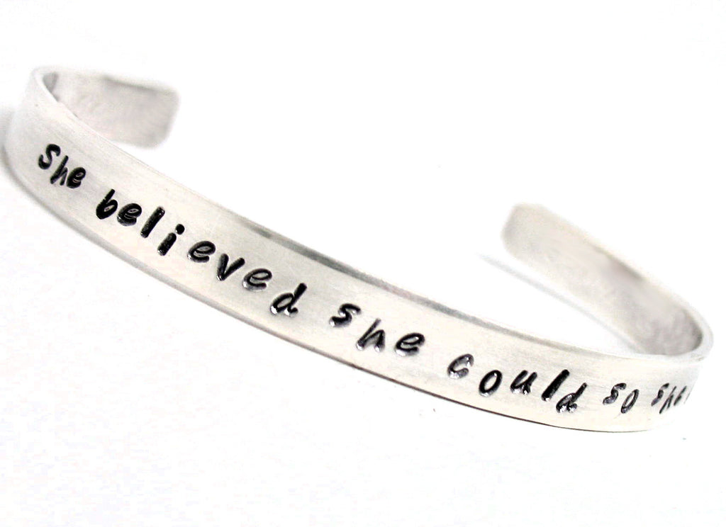 A skinny, solid copper cuff bracelet hand-stamped by the Foxwise crew with 'She believed she could so she did' in our Jeanie font. Third photo shows the same bracelet (well, actually it's the sterling silver version, which you can get here, but it's the same quote) in our Handwriting font, which we can substitute upon request.