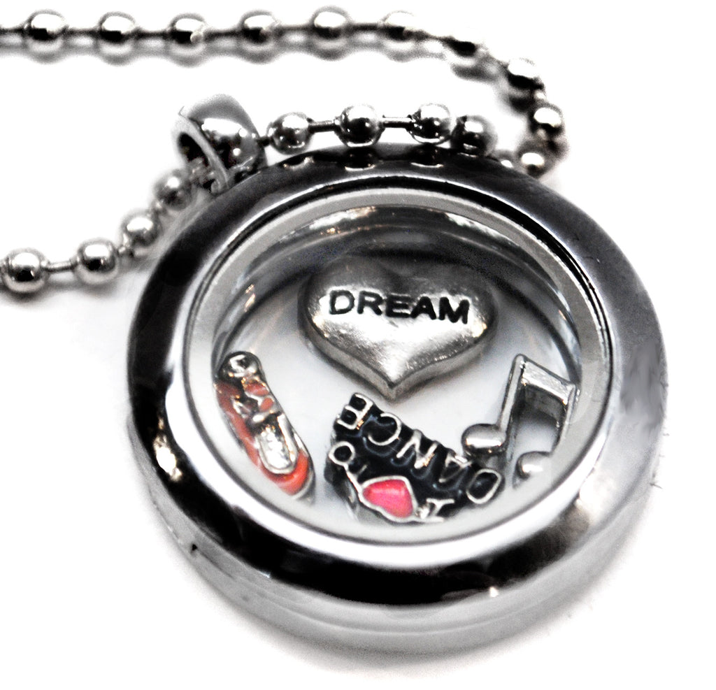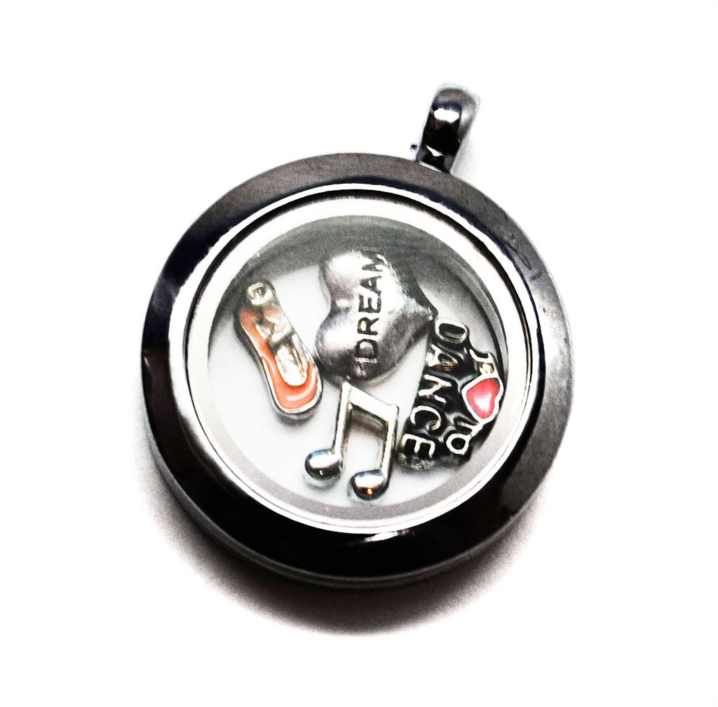 This 25mm stainless steel locket has a backing with the word ‘Dance’ on it, and includes four charms: a heart with the word "Dream" on it, a ballet slipper, music notes, and an "I (heart) to dance" charm.